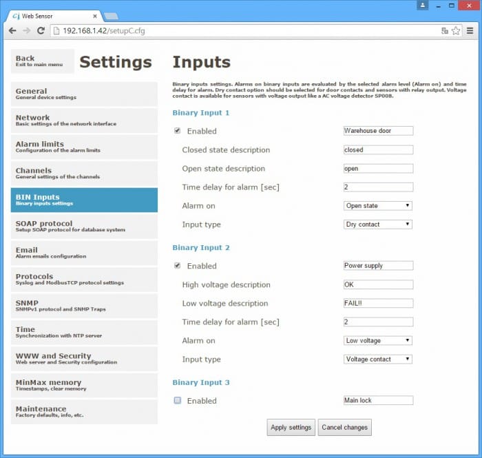 Вимірювач температури та вологості Ethernet інтерфейсом оснащений трьома бінарними входами та двома роз'ємами для підключення зовнішніх датчиків температури.