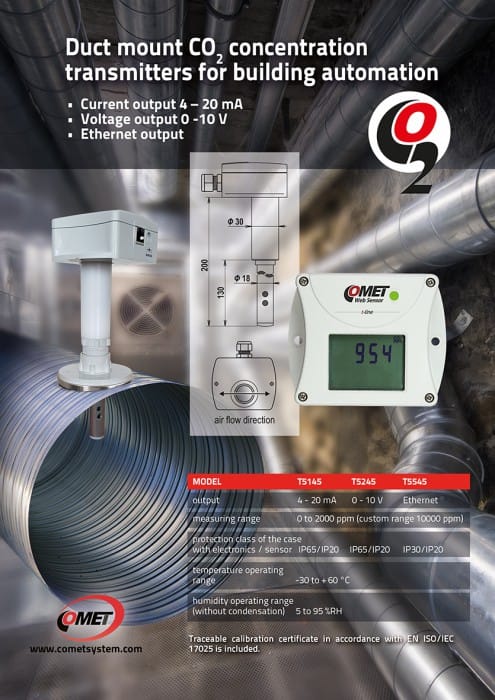 Comet T5545 датчик рівня CO2 канального монтажу з Ethernet інтерфейсом 1ch, 0 to 2 000 ppm, LCD, Duct mount