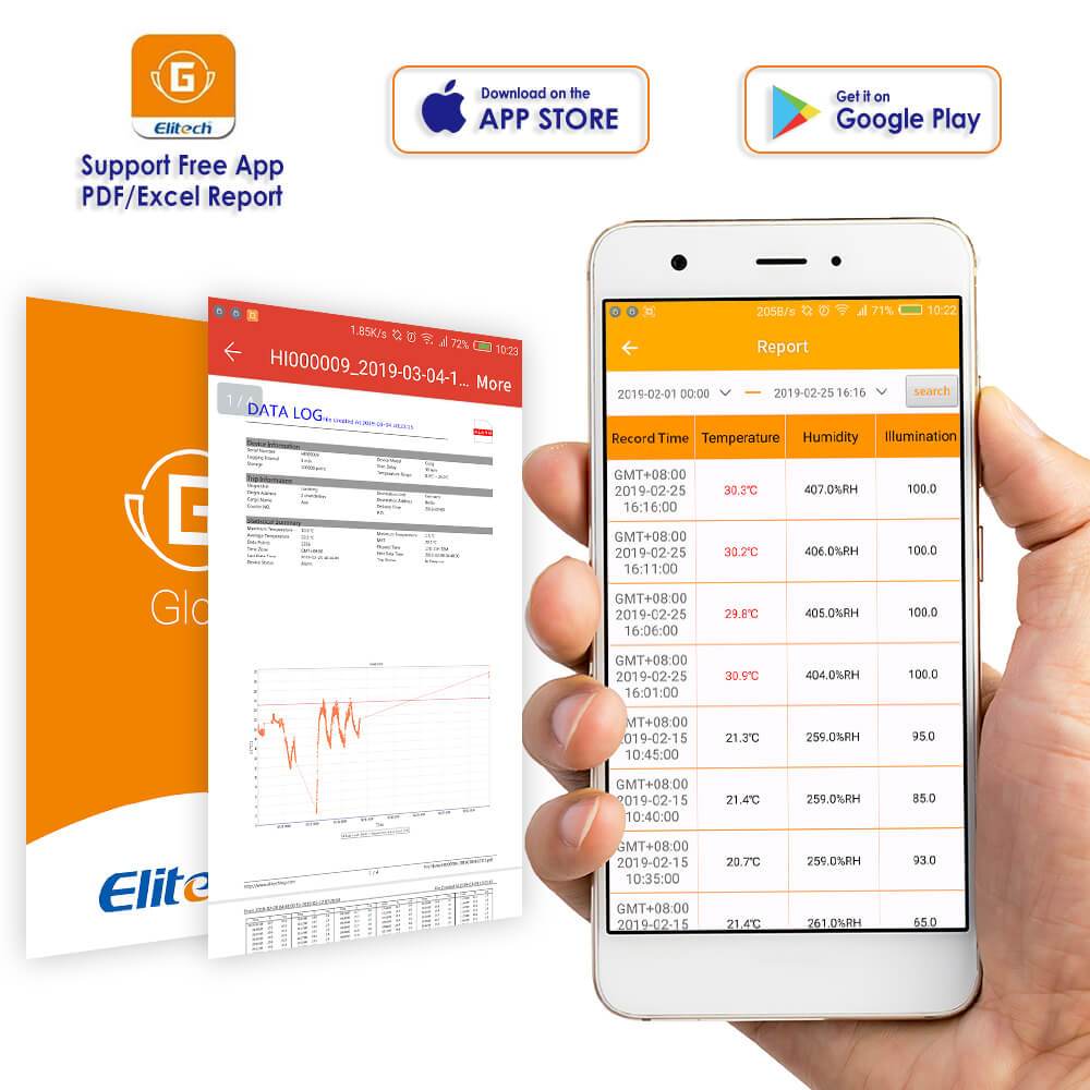 Реєстратор температури, положення та освітлення з високоточним датчиком температури та можливістю дистанційного запиту в режимі реального часу за допомогою технології 4G. Реєстратор може передавати дані по бездротовій мережі до хмари Elitech Cloud. Автоматичне сповіщення на електронну пошту у випадку перевищення лімітів температури. Завантаження звіту у форматі PDF і Excel з Elitech Cloud. Датчик освітлення для виявлення відкриття дверей/коробки при транспортуванні.