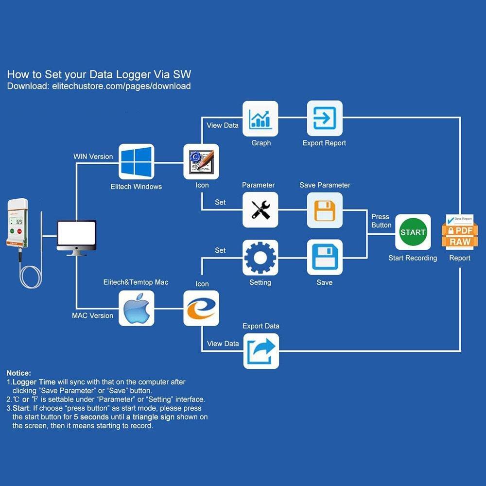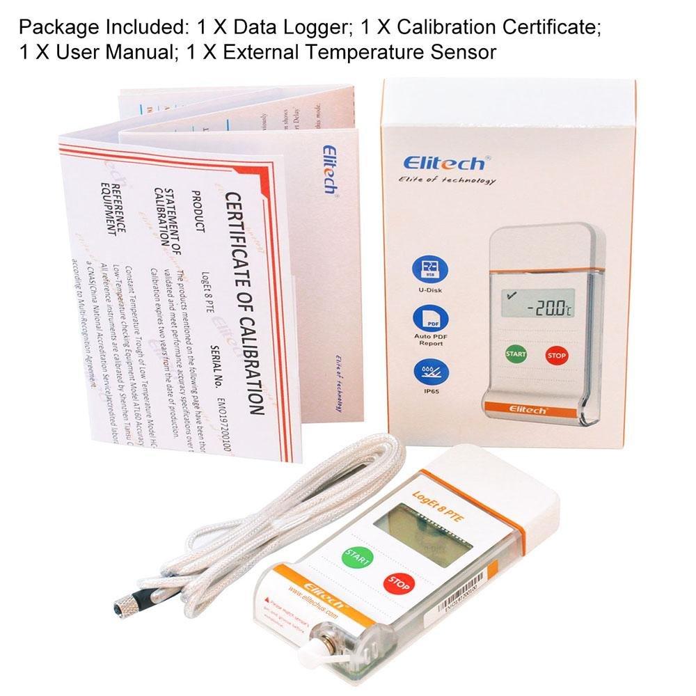 Реєстратор температури багаторазового використання з виносним датчиком температури, LCD екраном та USB роз'ємом. Автоматичне генерування PDF звіту. Має широкий спектр вимірюваних температур від -85 до +150 °C. За допомогою безкоштовного програмного забезпечення ElitechLog можна налаштуватии параметри реєстратора включаючи режим запуску/зупинки, встановити пороги спрацьовування сигналізації, сигнал тривоги, пароль захисту, одиниці вимірювання і.т.д.