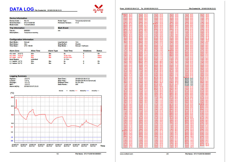USB реєстратор температури одноразового використання з автоматичним генеруванням PDF звіту. Зручний та легкий у використанні, тонкий корпус. Генерування звіту з автоматичним шифруванням данних при підключенні USB до ПК. Водонепроникний корпус IP67. Для зчитування даних програмне забезпечення не потрібне. Відрізняється від RC-18 можливістю налаштування до 5 сигналів тривоги.