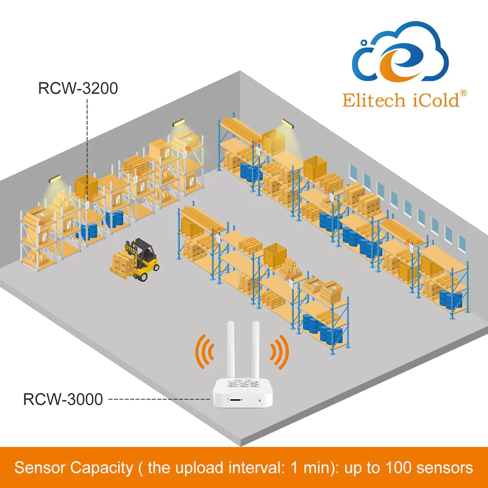 Система моніторингу температури та вологості RCW-3000 використовує технології передачі даних LoRa, 4G, Wi-Fi та інші. Він складається з шлюза бездротових датчиків, хмарного сховища та мобільних додатків. Шлюз здатний завантажувати дані через бездротові мережі 4G та Wifi. Зв'язок між шлюзом та датчиками температури і вологості реалізован на базі бездротовой передачі даних LoraWAN, з діапазоном частот від 868.00 до 868.60 MHz. За допомогою хмарного сховища, WEB платформи та додатку на IOS/Android може реалізовуватись віддалений моніторинг даних, складання історії даних, будування графікіф залежності, віддалене сповіщення про тривогу та інші функції. Система моніторингу на базі RCW-3000 широко використовується у великих холодильних камерах, сховищах, лікарнях, супермаркетах тощо. Базова станція RCW-3000 підтримує датчики RCW-3200 та минулого покоління RCW-2200.Особливості: