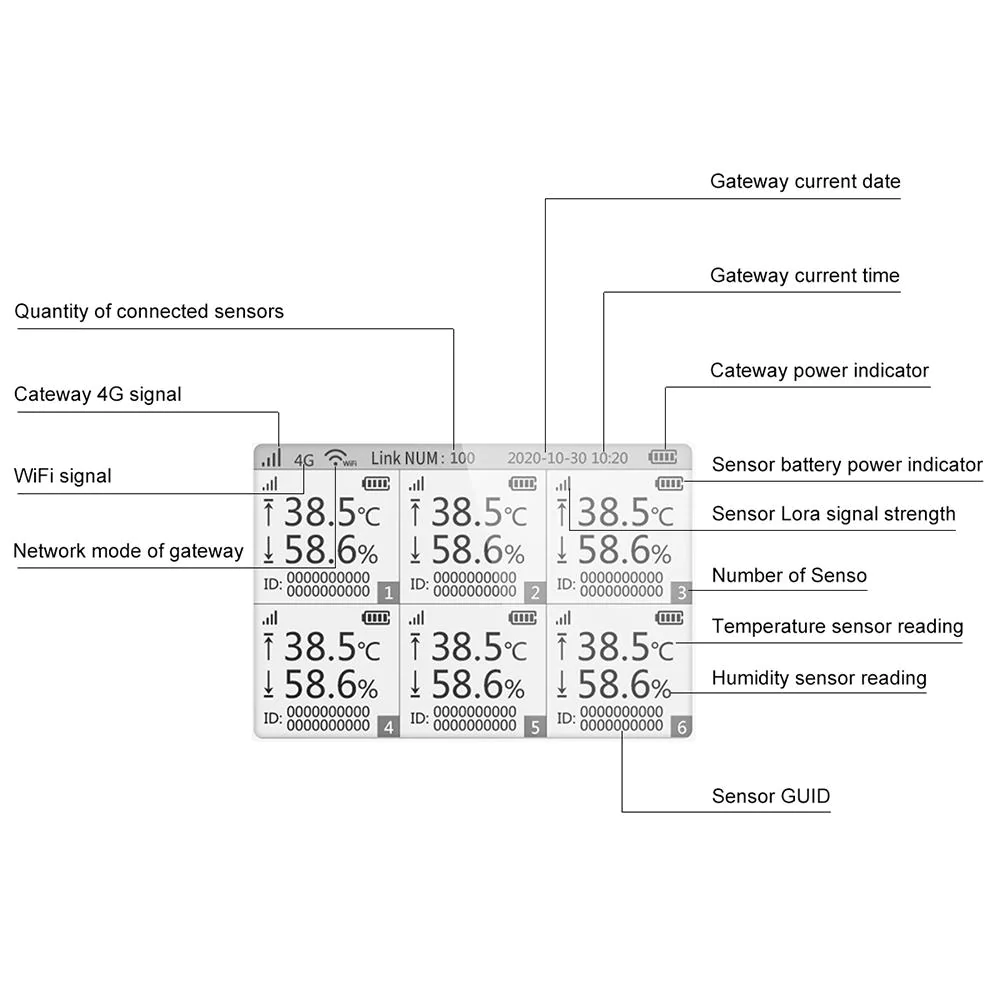 Кількість контактів ≤100 сенсорів Вимірювання Температура, Відносна вологість Інтерфейс LoRaWAN, Wi-Fi, 4G, USB Type-C Спосіб оповіщення E-mail, Додаток на смартфон Дисплей Так Частота LoRa 868.00 – 868.60 MHz Джерело живлення акумулятор 5000 mAh Розміри 130х130х35 мм Зовнішнє джерело живлення 5V/2A DC -