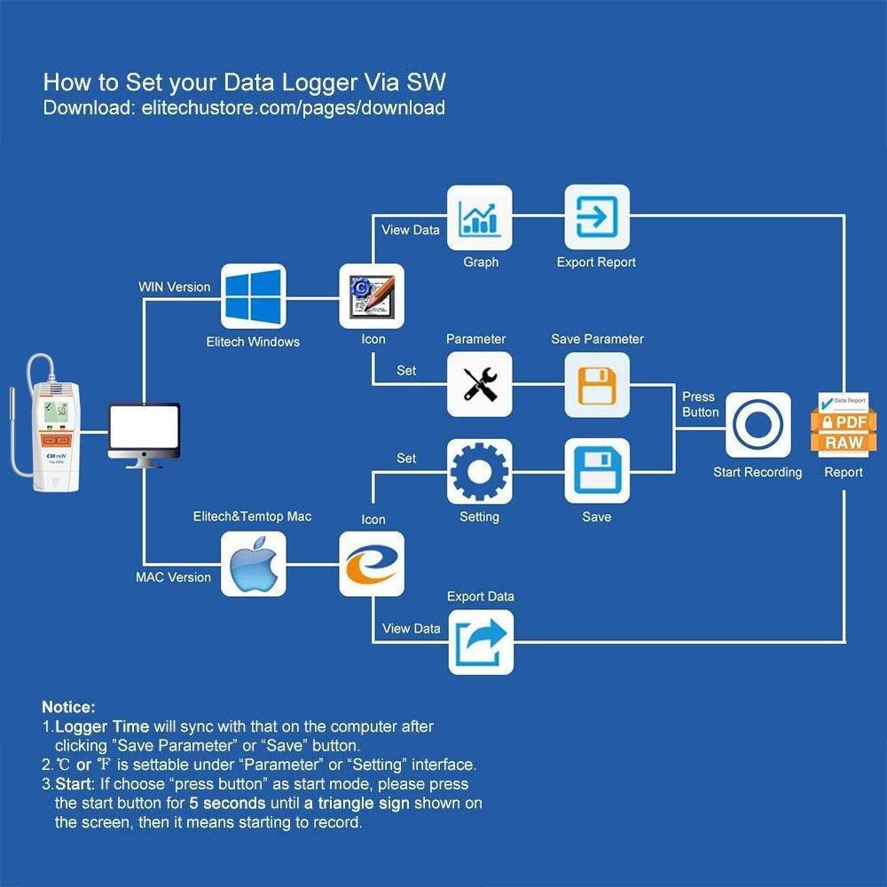 USB реєстратор температури багаторазового використання з автоматичним генеруванням PDF звіту та з можливістю захисту паролем. Дані можуть бути також збережені в форматі PDF/ Excel для подольшого аналізу та обробки. Також є можливість встановити додаткові параметри такі як одиниці вимірювання та межі спрацювання сигналізації за допомогою додатку Elitechlog.