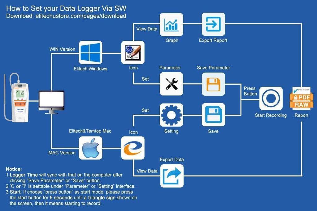 USB реєстратор температури багаторазового використання з автоматичним генеруванням PDF звіту з можливістю захисту паролем. Дані можуть бути збережені в форматі PDF/ Excel для подольшого аналізу та обробки. Високоточний зовнішній датчик з надшироким діапазоном вимірюваних температур від -196 до +150 °C. Також є можливість встановити додаткові параметри такі як одиниці вимірювання та межі спрацювання сигналізації за допомогою додатку Elitechlog.