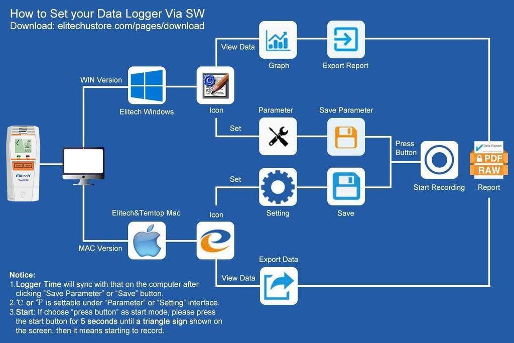Bluetooth реєстратор температури та вологості багаторазового використання з автоматичним генеруванням PDF звіту з можливістю захисту паролем. Можливість безпровідного моніторингу даних та керування за допомогою технології Bluetooth через додаток Elitechlog. Дані можуть бути також збережені в форматі PDF/ Excel для подольшого аналізу та обробки.