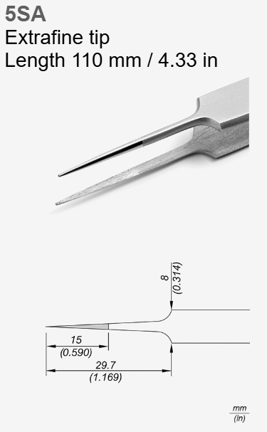 Пінцет 5SA має напрочуд тонкі видовжені кінчики для збільшення оглядовості при роботі з мініатюрними SMD.Характеристики