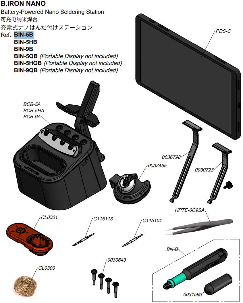 - BN-B - паяльник B·NANO (15 Вт, Li-Ion 7.4V / 120 mAh) - легка ручка без жала із запобіжним ковпачком B1596 (0031596) та затискачем для перенесення, комплектується наконечниками-картриджами серії C115