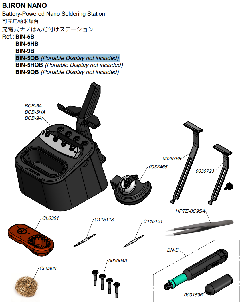 - BN-B - паяльник B·NANO (15 Вт, Li-Ion 7.4V / 120 mAh) - легка ручка без жала із запобіжним ковпачком B1596 (0031596) та затискачем для перенесення, комплектується наконечниками-картриджами серії C115