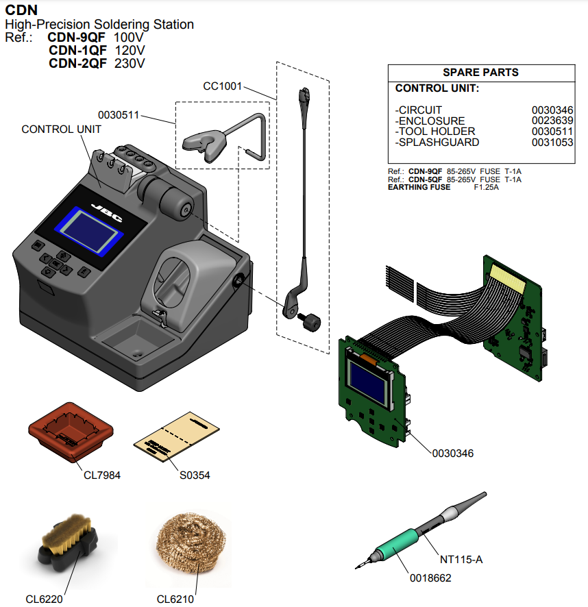 - Блок управління (60 Вт, 230 В, 50/60 Гц, запобіжник T1A) у єдиному корпусі з підставкою для паяльника, очищувачем наконечника та приладом заміни картриджа