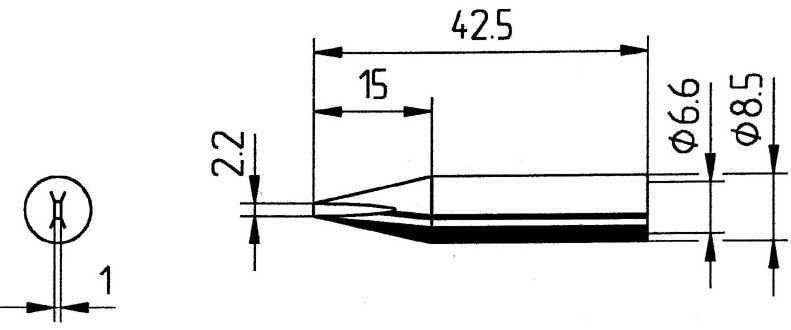 Тип жал Паяльні жала Форма Долотоподібна Серія 842 Ширина, мм 2.2 Товщина, мм 1 Внутрішній діаметр гільзи 6.60 Зовнішній діаметр гільзи 8.50 Довжина, мм 42.5 Метеріал покриття long-life tip -