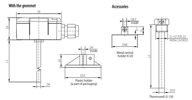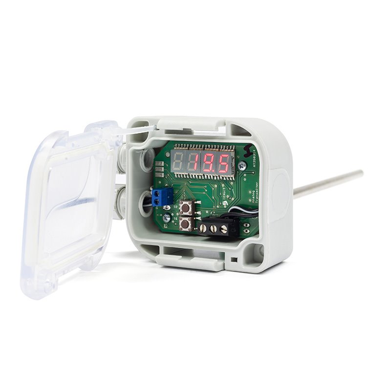 Датчик температури з дисплеєм призначений для вимірювання температури рідких або газоподібних речовин. Конструкція датчика дозволяє використовувати його для вимірювання температури в повітроводах. Комбінація датчика температури і захисної гільзи підходить для вимірювання температури в трубопроводах. Термочутливий елемент розташований в металевому корпусі завдовжки 120 мм (доступні варіанти з довжиною 70 - 420 мм). Пластикова комутаційна головка датчика температури з дисплеєм оснащена кабельною втулкою (можливі варіанти з роз'ємом), виміряна температура відображається на 4-значному дисплеї, розташованому під прозорою кришкою. Датчик температури з дисплеєм може використовуватися для будь-яких систем управління, сумісних з вихідними сигналами. Максимальна температура навколо голови становить від -30 до 70 ° C без перевищення навіть на короткий час. Датчики температури з дисплеєм відповідають ступеню захисту IP 65 згідно з EN 60529.