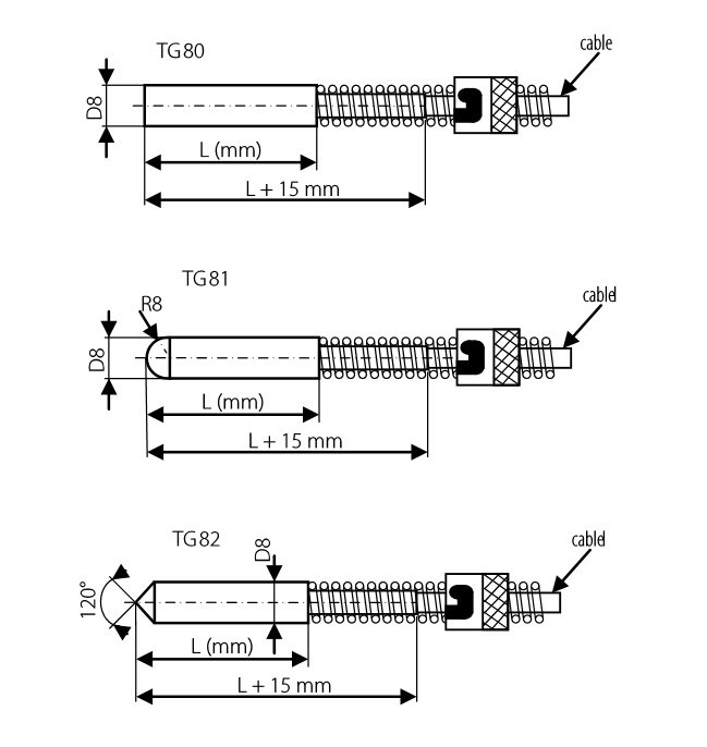Sensit серія датчика температури TG80 з байонетом та пружиною, TC J, TC K, TC T, Ø8 mm, довжиною від 10 до 85 mm, -50 °C до +350 °C, IP 50, 1m