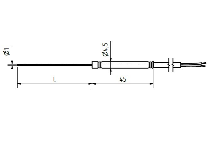 Термопара J-типу (інші по запиту) в корпусі діа. 1мм з кабелем, температура вимірювання до 600 °C (може бути змінено в залежності від типу чутливого елементу та кобеля). Датчики температури можна використовувати для будь-яких систем управління, сумісних із вибраним типом термопари. Датчики відповідають захисту IP 67 згідно з EN 60529, з поправками залежно від типу термопари та кабелю. Діаметр корпусу 1 мм забезпечує дуже швидку реакцію датчика на перепади температури.Датчики температури призначені для роботи в хімічно неагресивному середовищі.