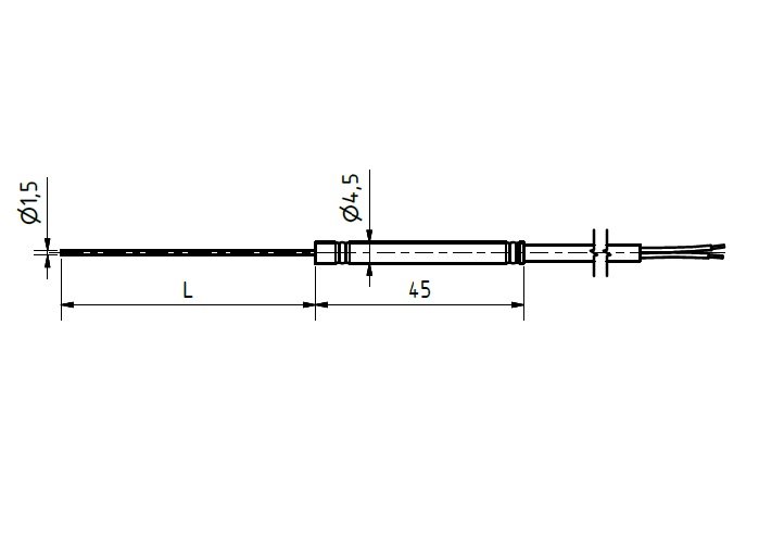 Термопара К-типу в корпусі діа. 1.5 мм та довжино корпусу 1000 мм з селіконовим кабелем, температура вимірювання до 800 °C (обмеження ізоляції кабеля по температурі 200 °C). Датчики температури можна використовувати для будь-яких систем управління, сумісних із вибраним типом термопари. Датчики відповідають захисту IP 67 згідно з EN 60529. Діаметр корпусу 1,5 мм забезпечує дуже швидку реакцію датчика на перепади температури.Датчики температури призначені для роботи в хімічно неагресивному середовищі.